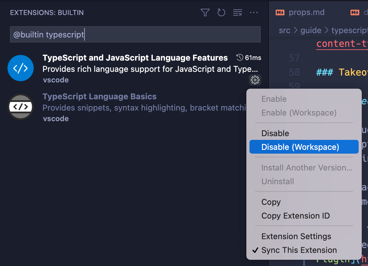 typescriptу вікні пошуку розширення (не видаляйте префікс@builtin). - Натисніть маленьку піктограму шестірні «TypeScript and JavaScript Language Features» і виберіть «Disable (Workspace)».
